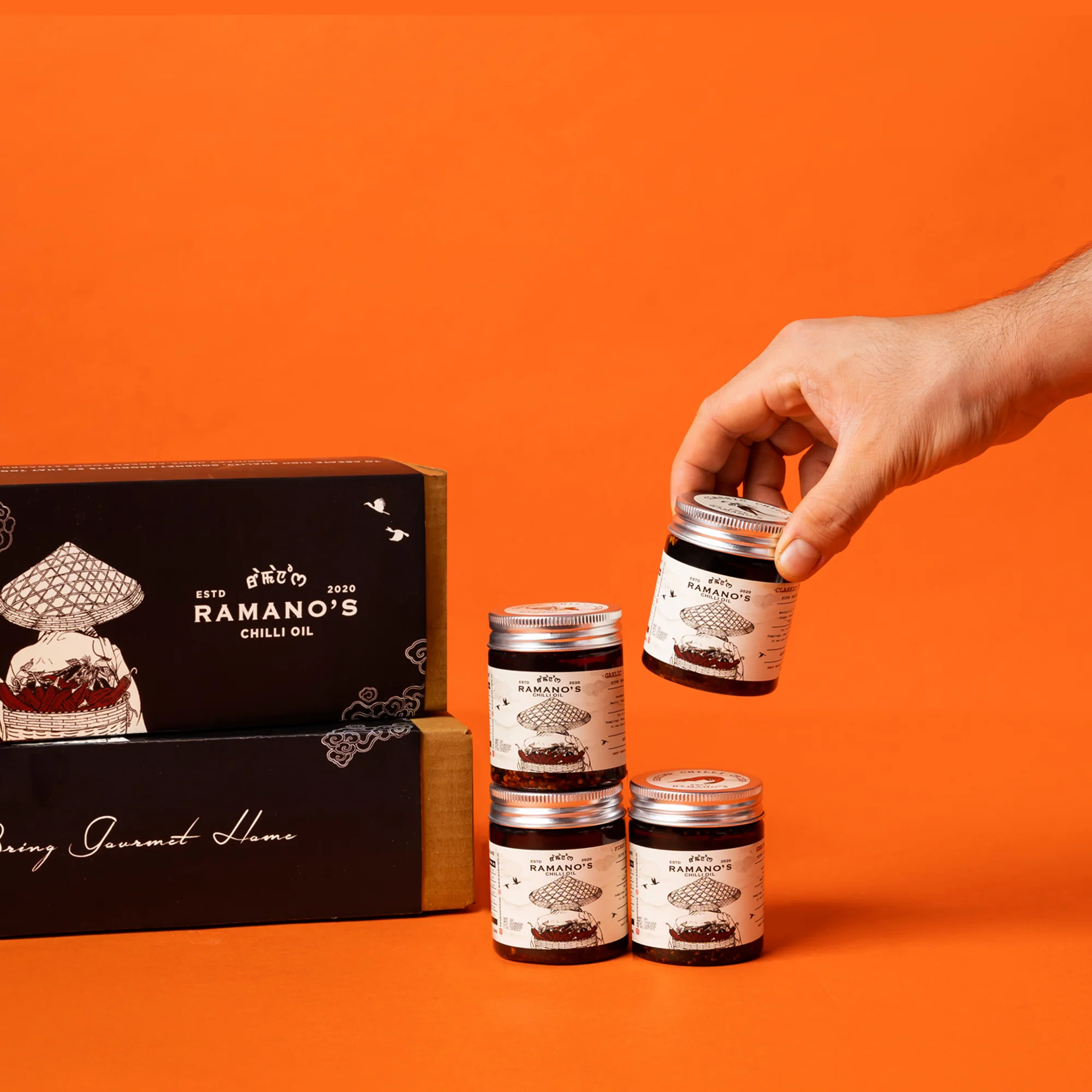 Discover a world of bold flavours with Ramano’s specially curated Chilli Oil Sampling & Gifting Set. Unleash flavours with Ramano's OG chilli oil, Fiery OG chilli oil, Garlic chilli crisp, Classic chilli oil, Black bean chilli oil, Garlic crunch chilli crisp, Honey chilli, and Shrimp chilli crisp. Elevate every regular dish into a spicy and delicious masterpiece with our versatile chilli oil collection.